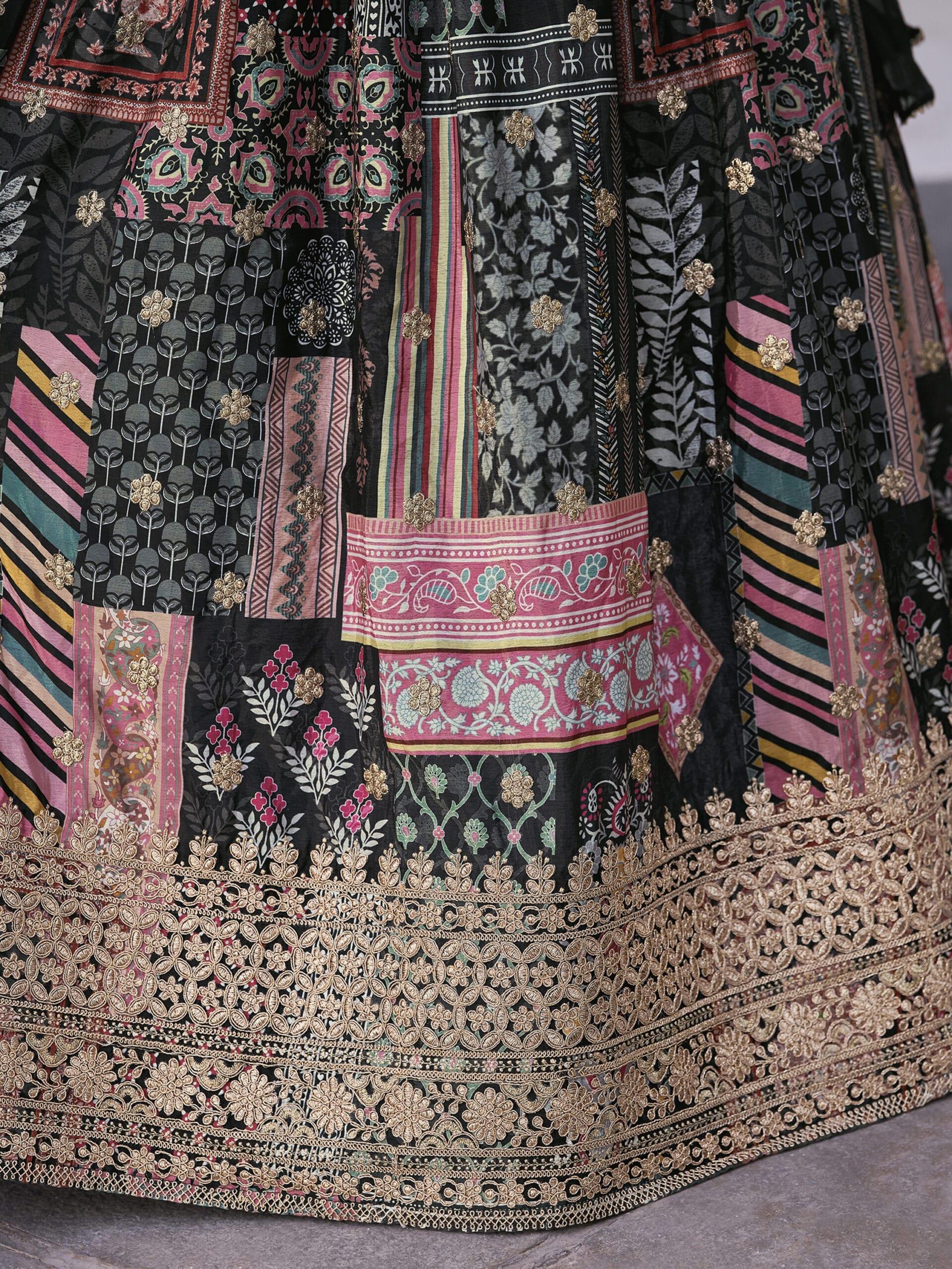 Black Chinnon Silk Lehenga with Digital Print & Zari Dori Embroidery