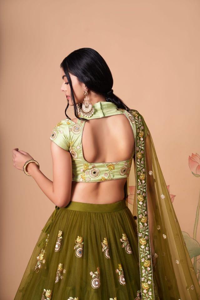 Mehndi Soft Net Lehenga with Thread, Zari, Dori & Sequins Embroidery and Mirror Work