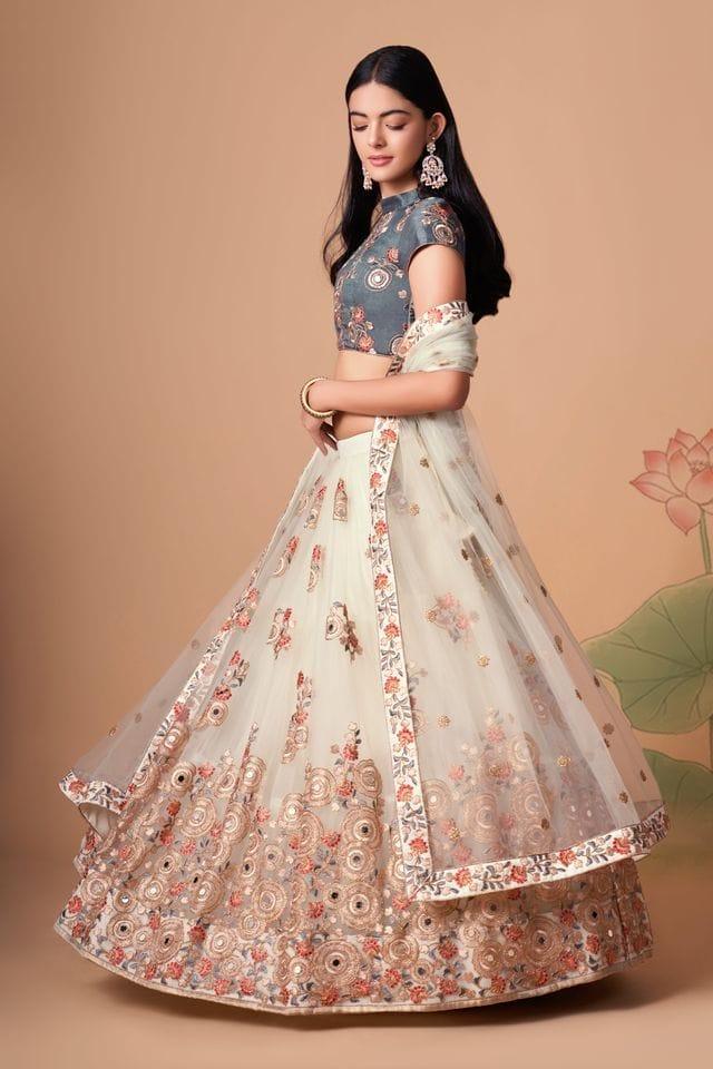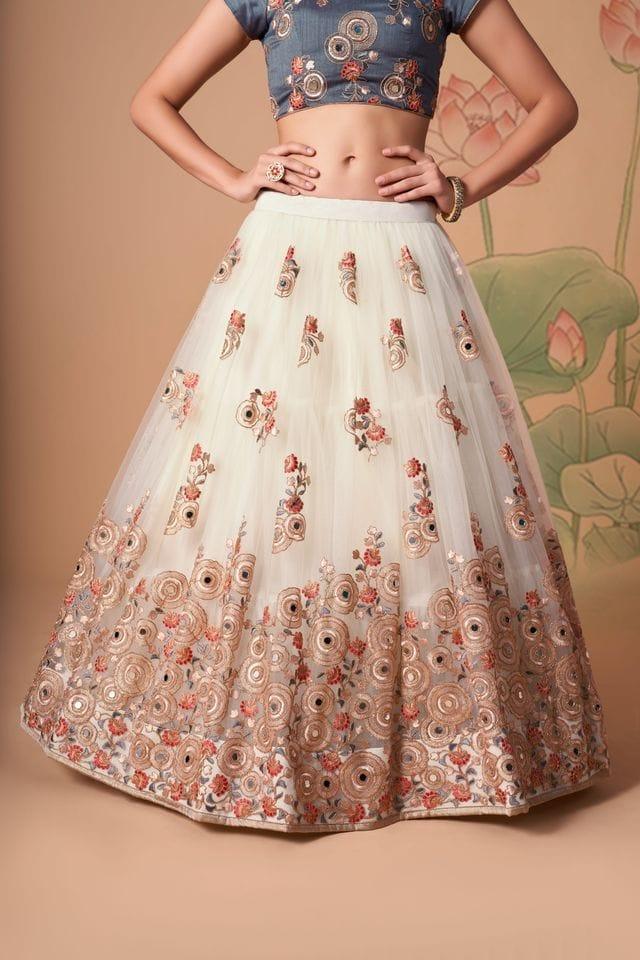 Off White Soft Net Lehenga with Thread, Zari, Dori & Sequins Embroidery and Mirror Work
