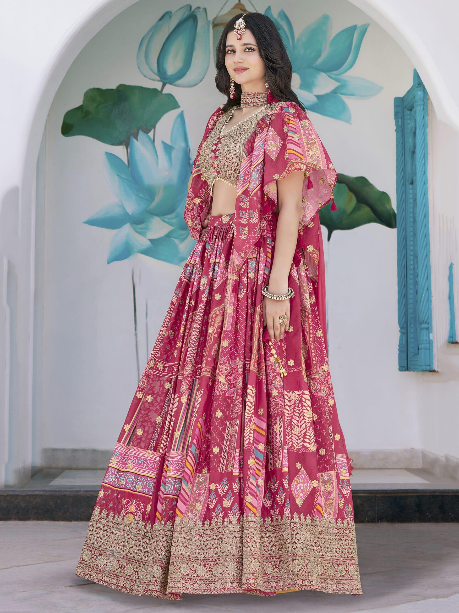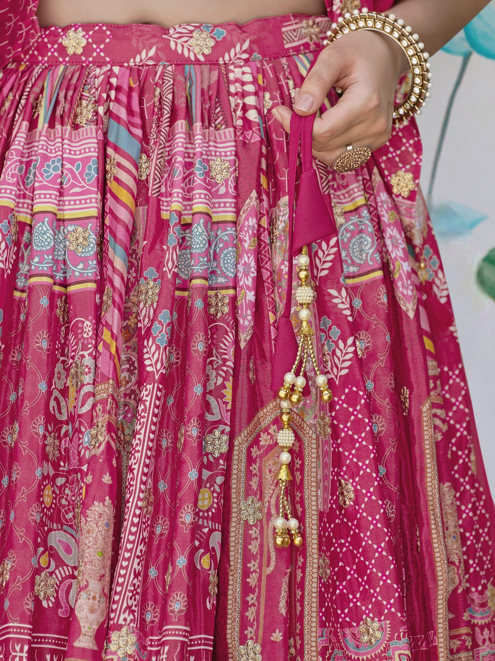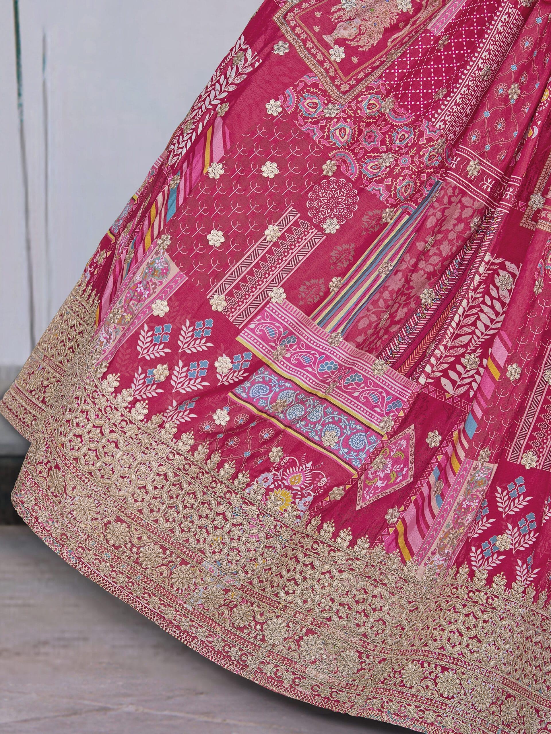 Pink Chinnon Silk Lehenga with Digital Print & Zari Dori Embroidery