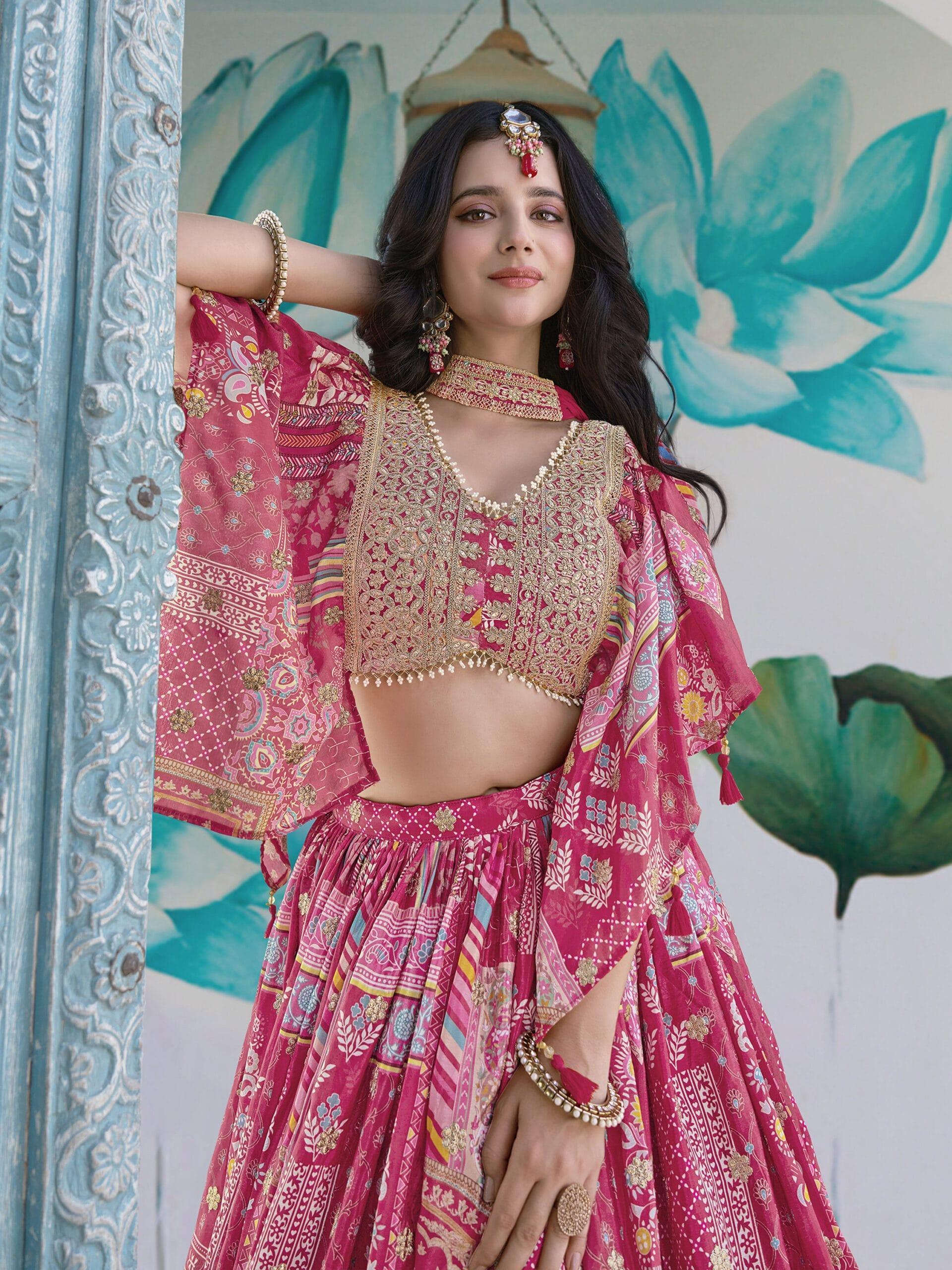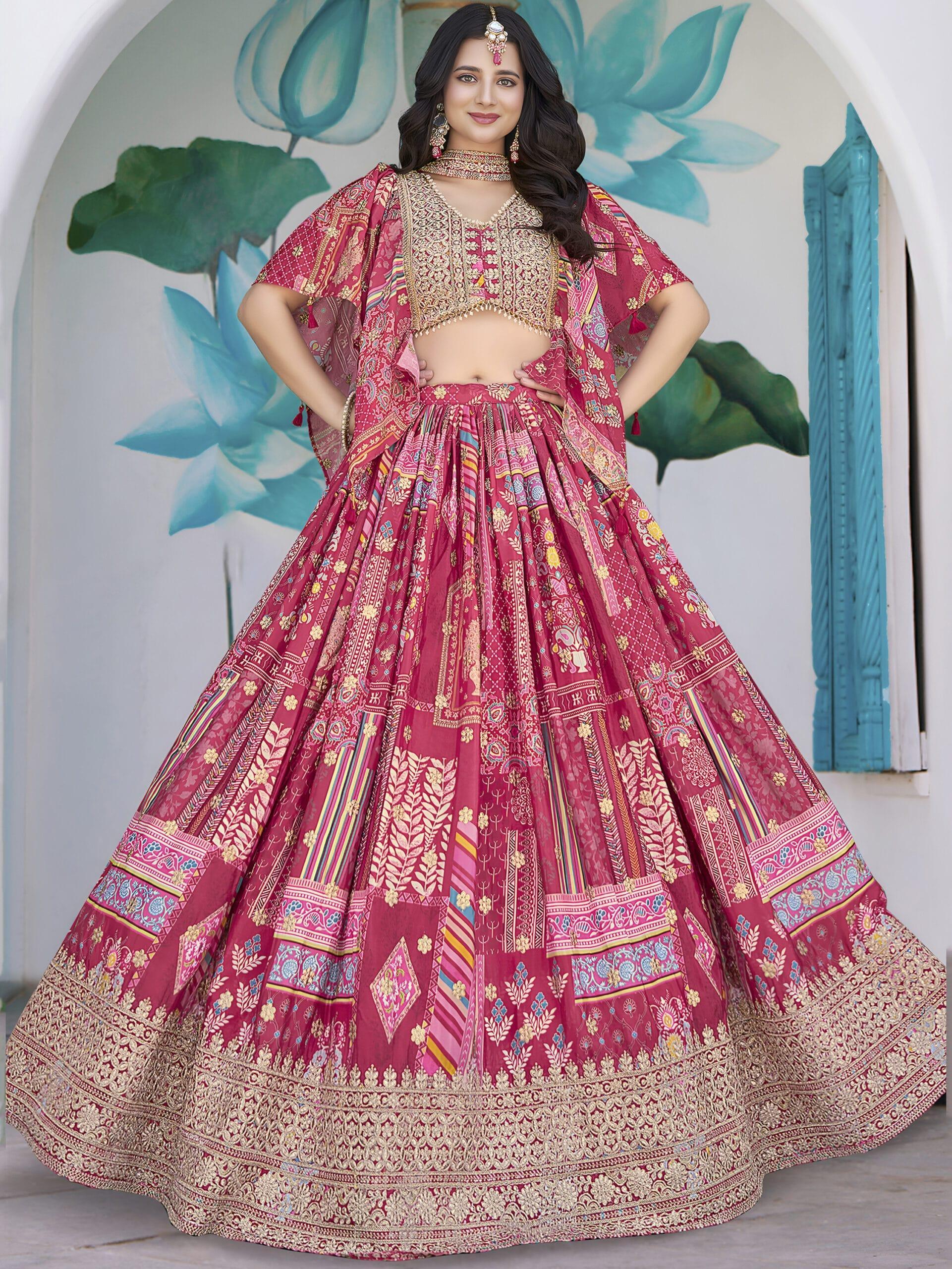 Be the first to review “Pink Chinnon Silk Lehenga with Digital Print & Zari Dori Embroidery” Cancel reply