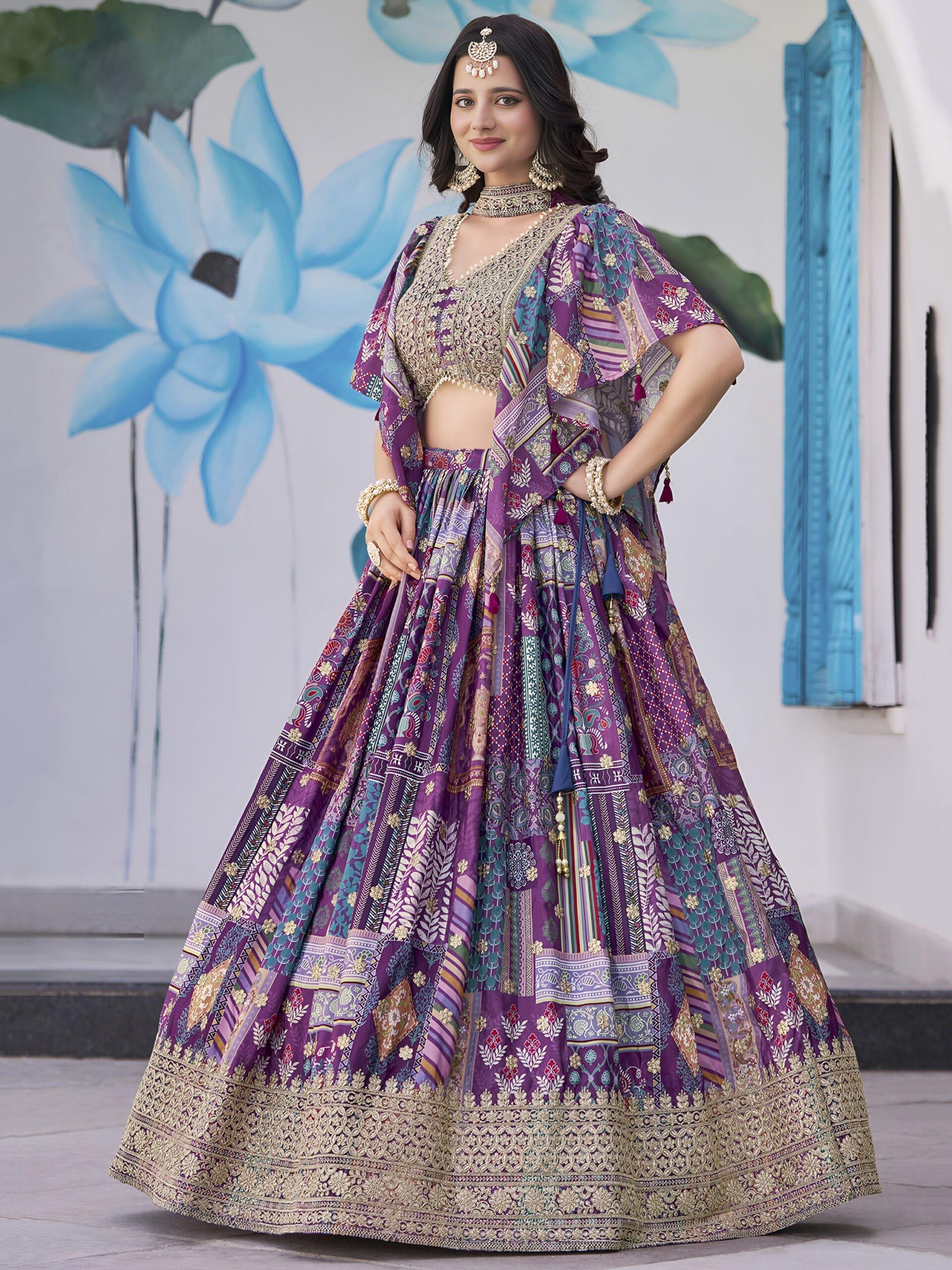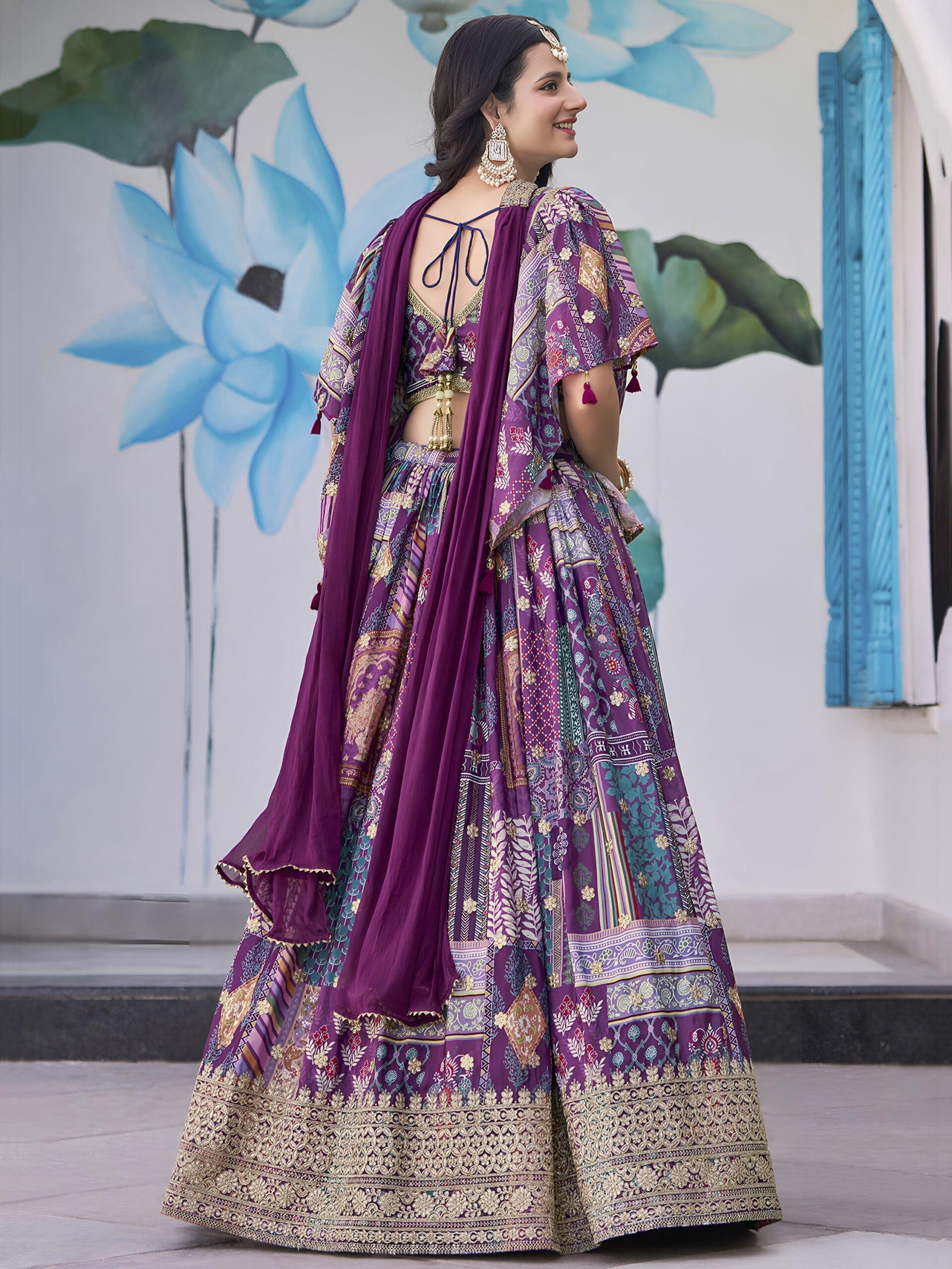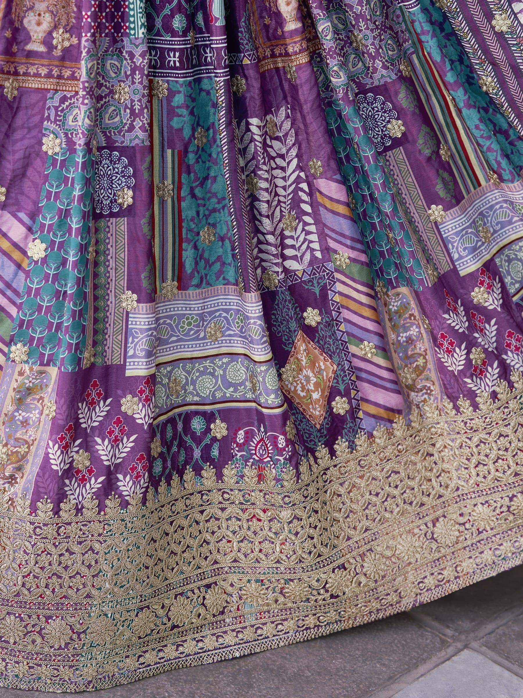 Purple Chinnon Silk Lehenga with Digital Print & Zari Dori Embroidery
