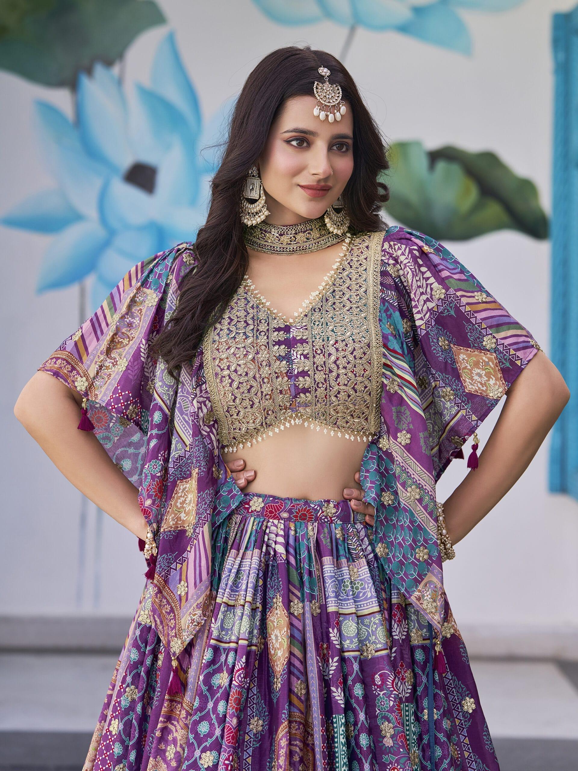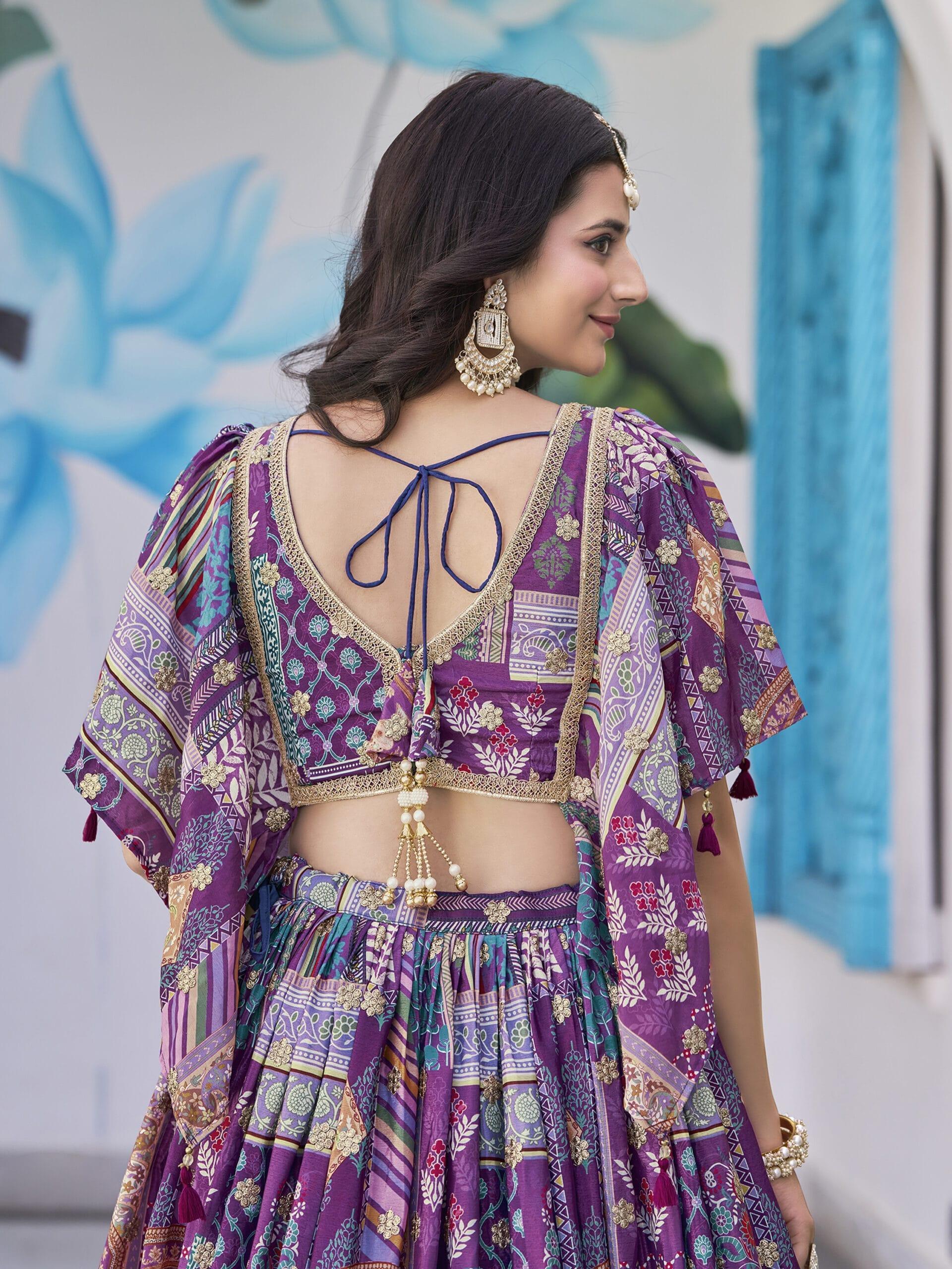 Be the first to review “Purple Chinnon Silk Lehenga with Digital Print & Zari Dori Embroidery” Cancel reply