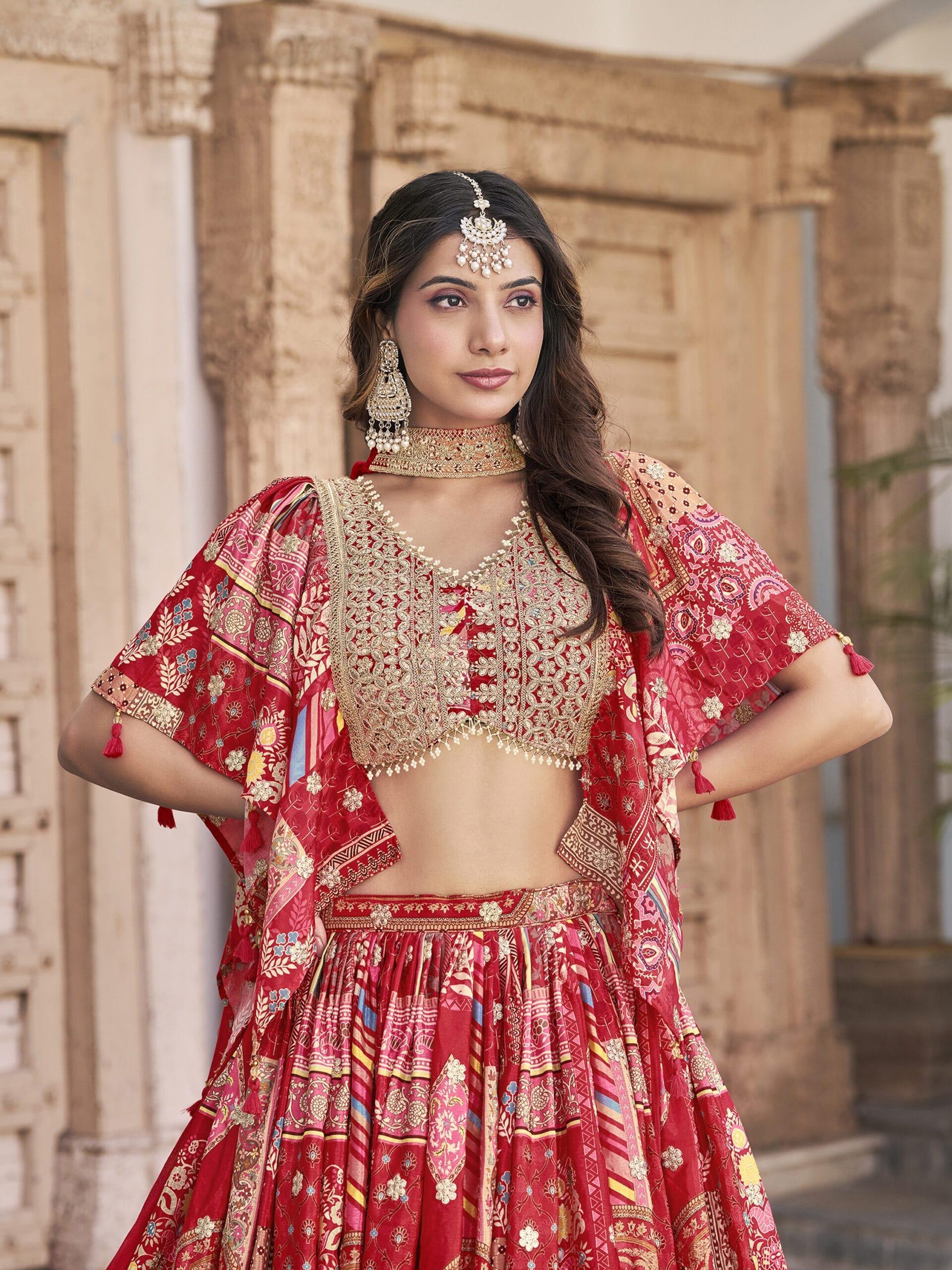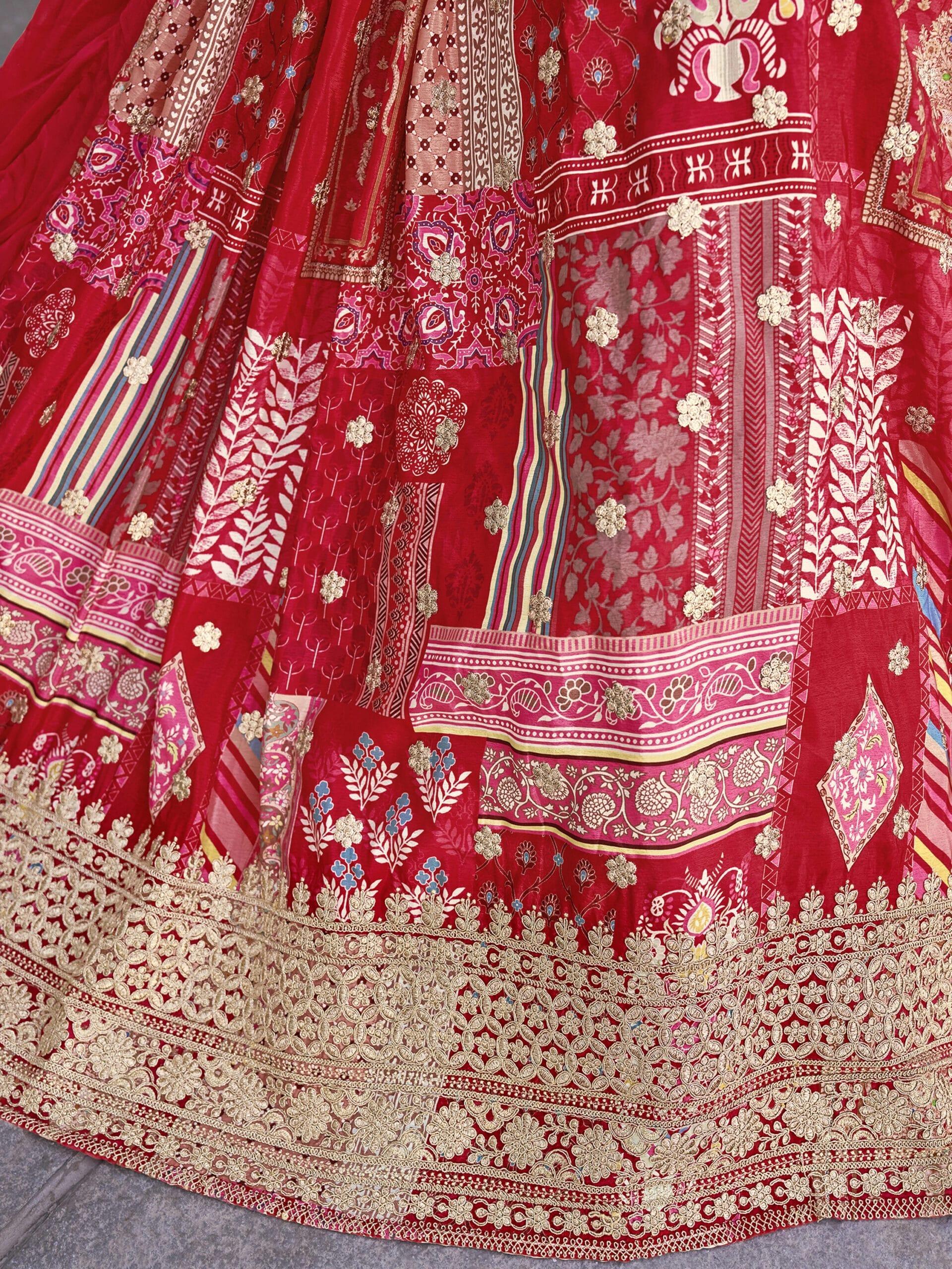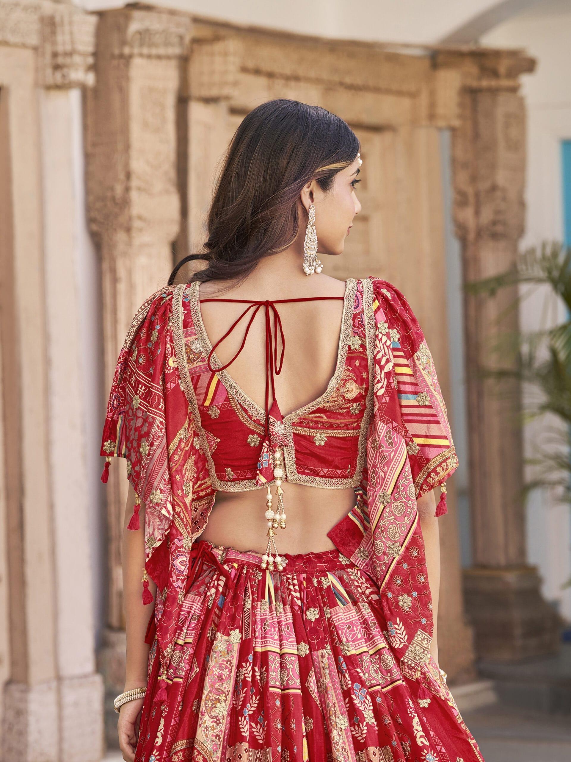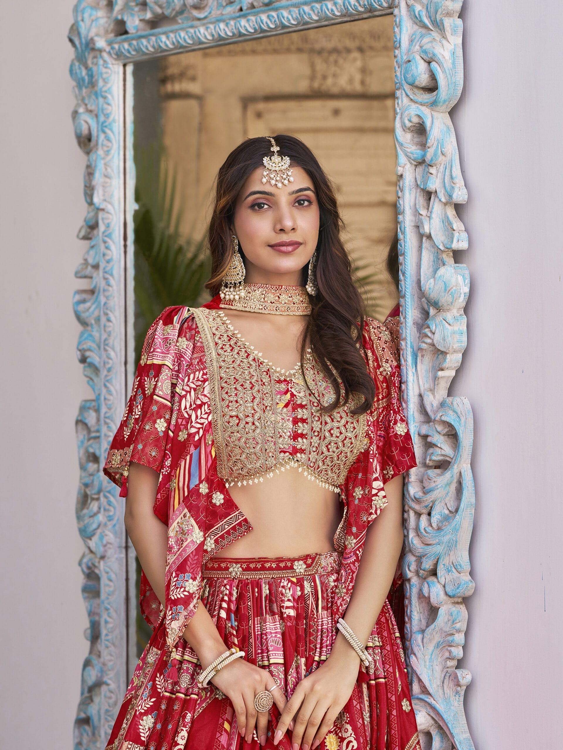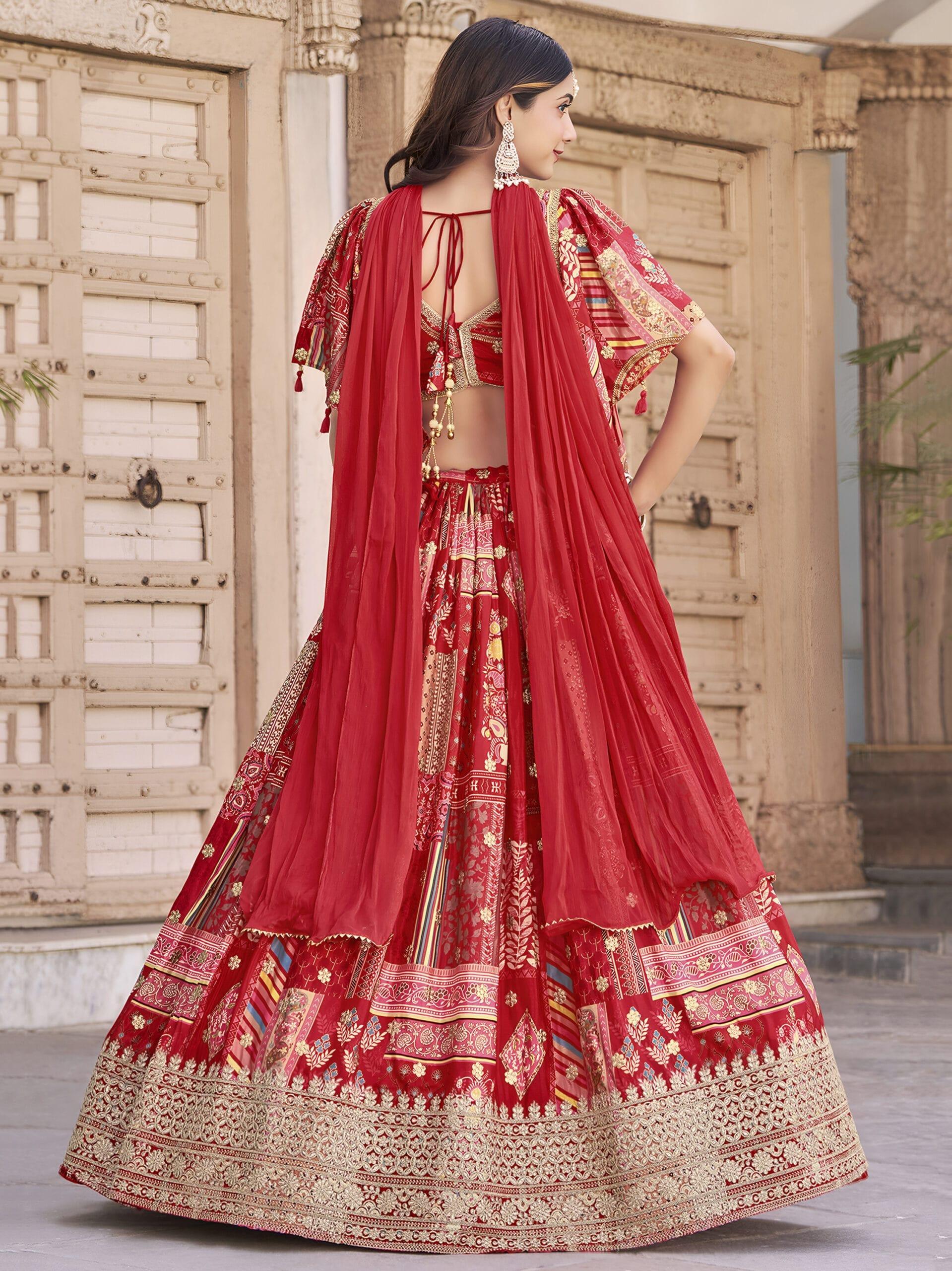 Red Chinnon Silk Lehenga with Digital Print & Zari Dori Embroidery
