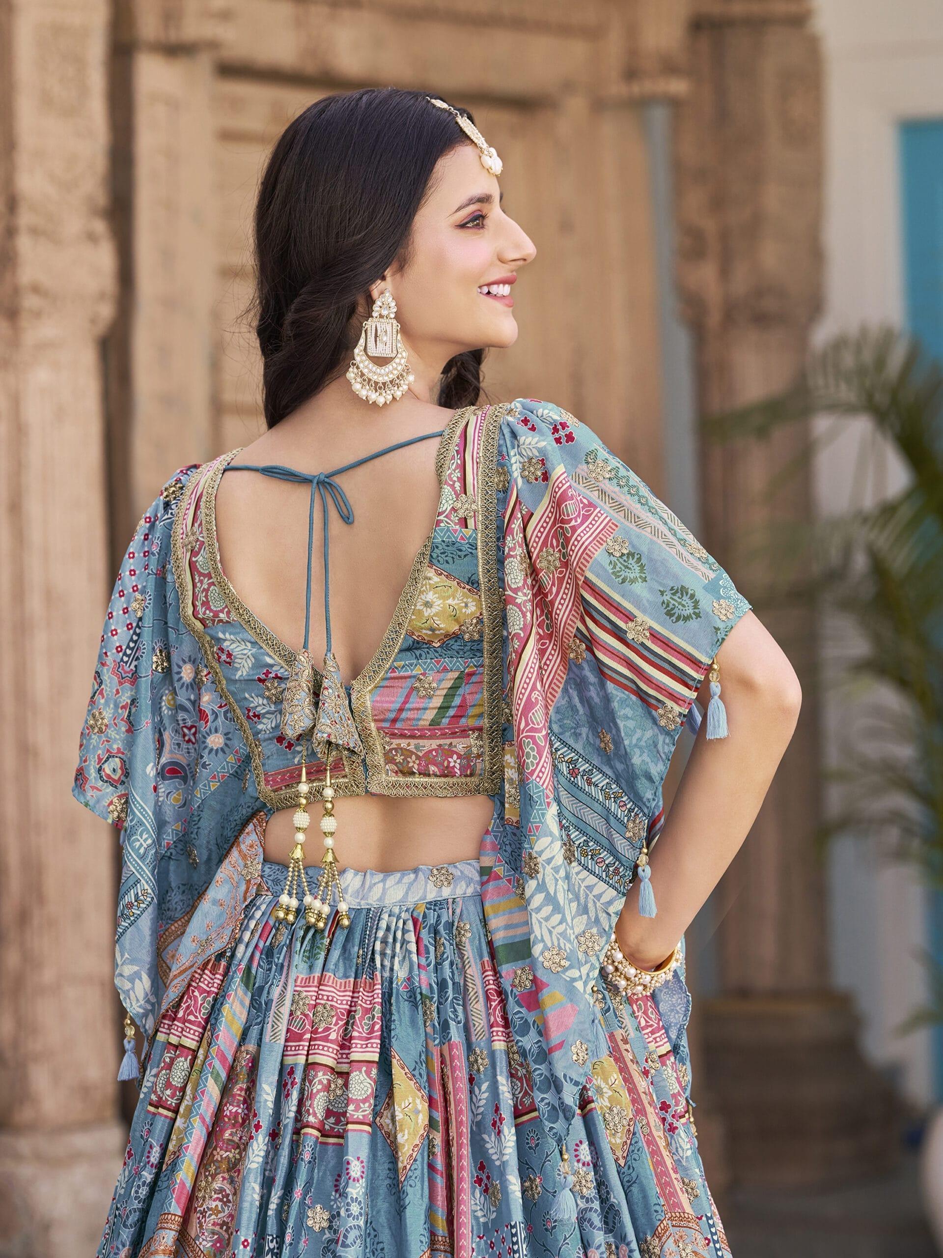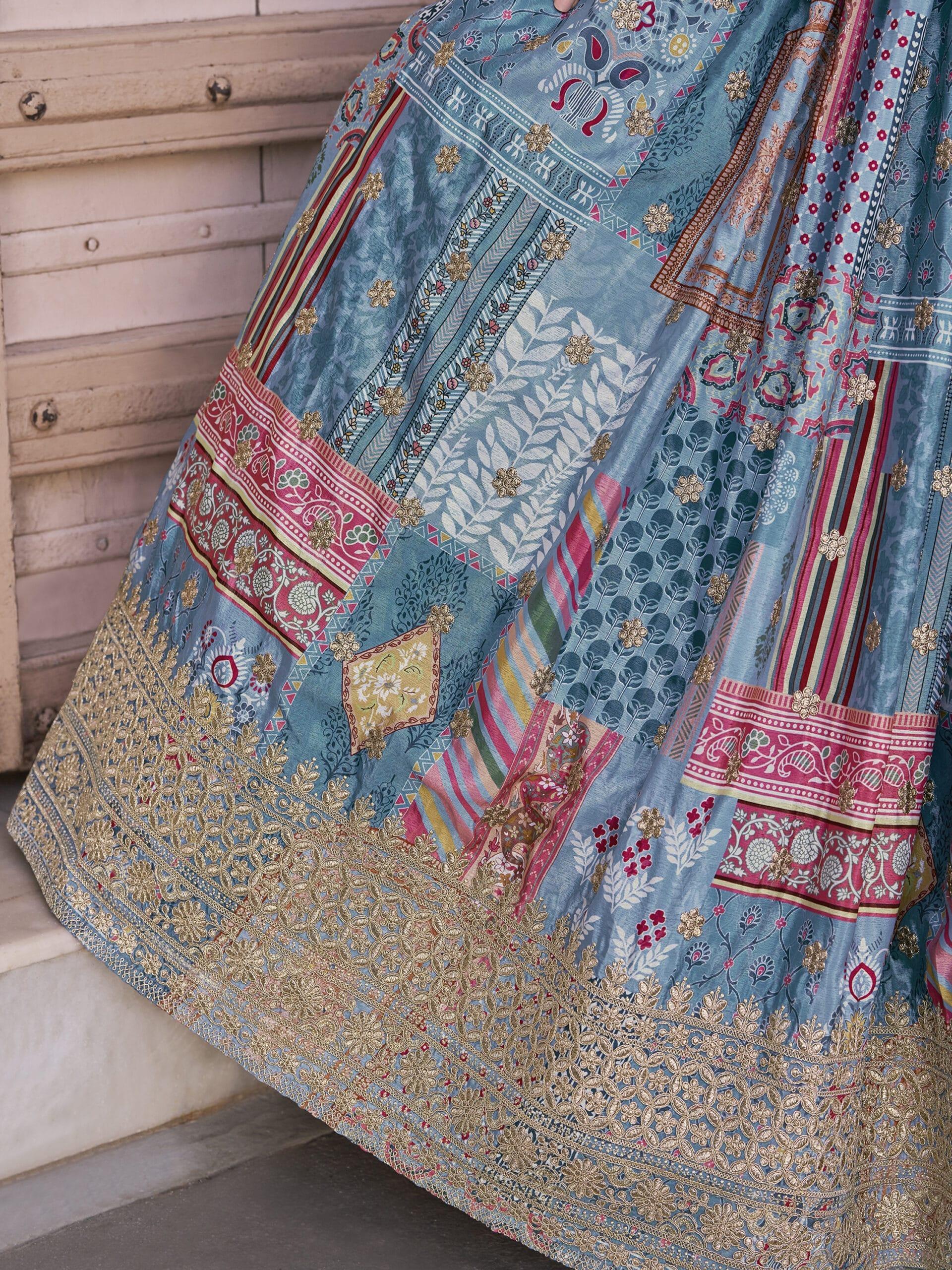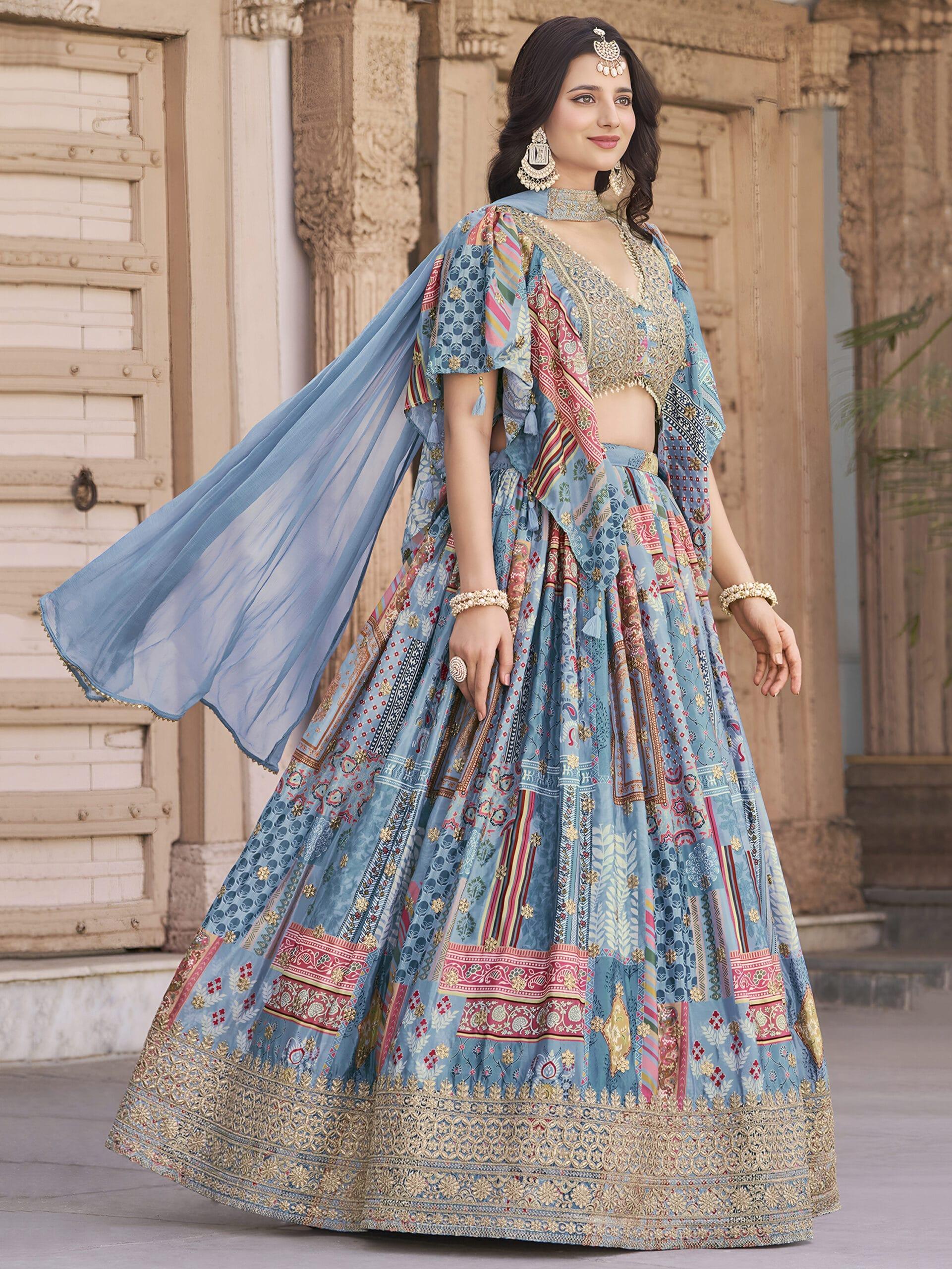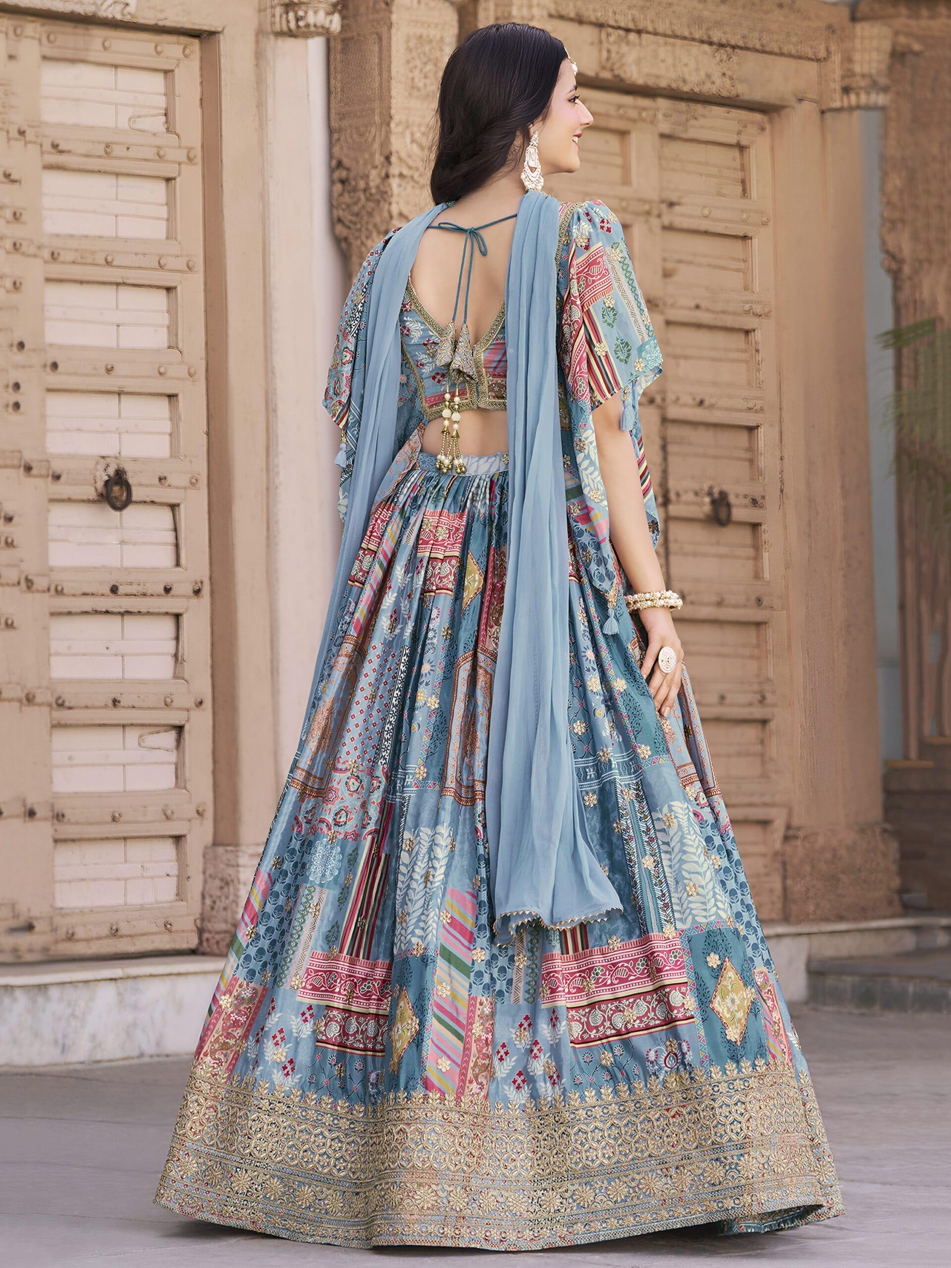 Sky Blue Chinnon Silk Lehenga with Digital Print & Zari Dori Embroidery