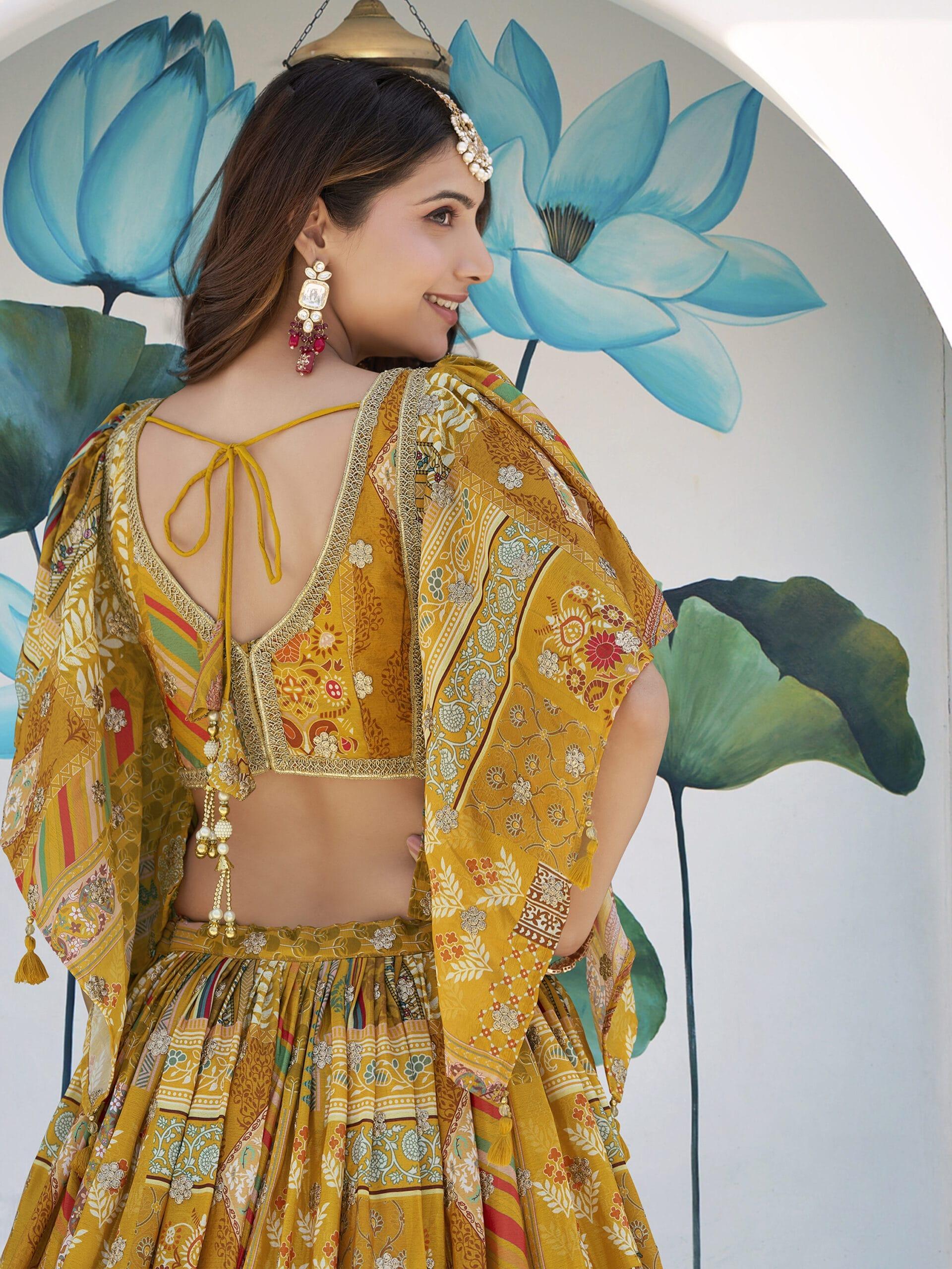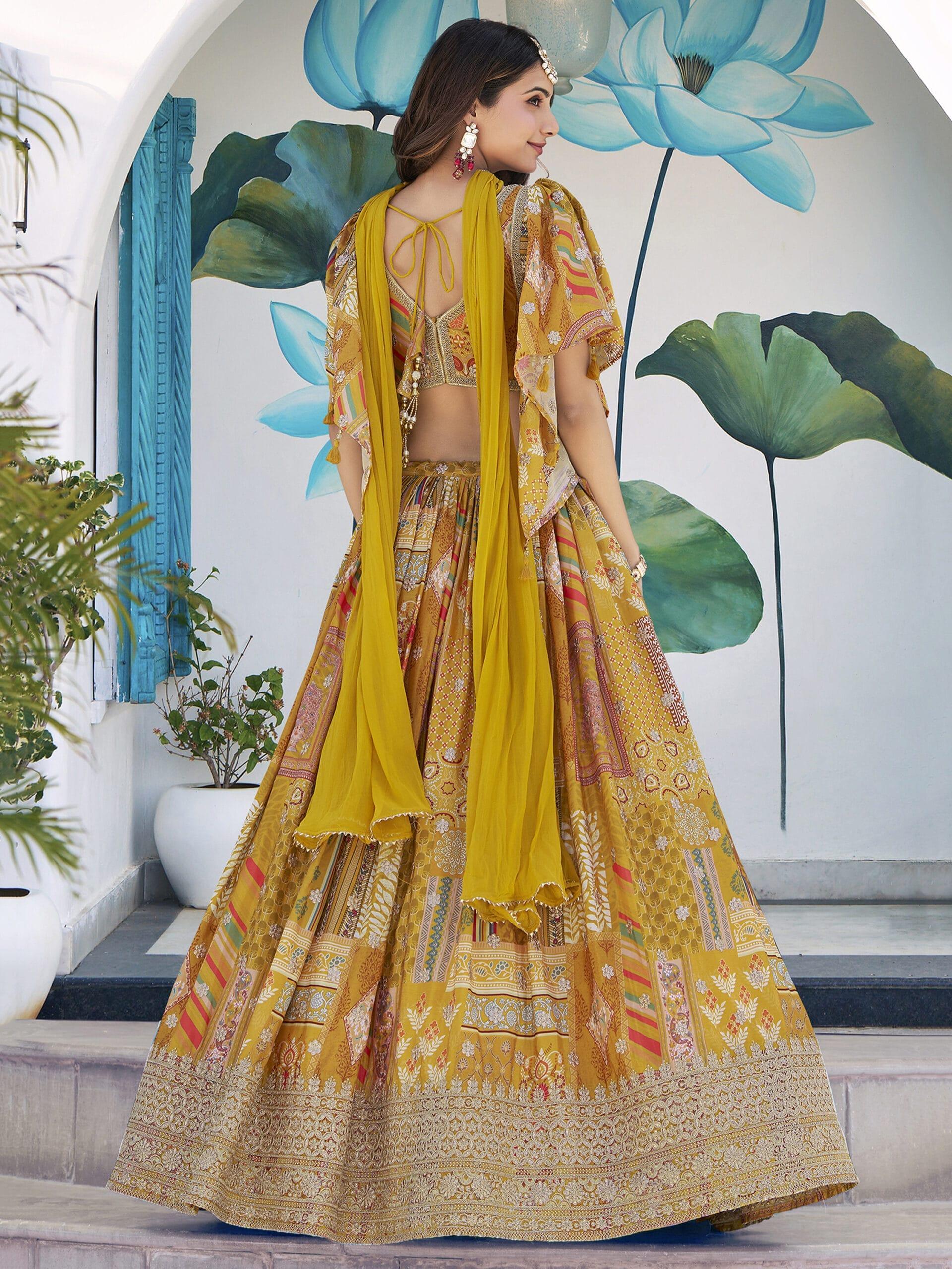 Fabric: Premium Yellow Chinnon Silk lehenga and unstitched blouse piece for a rich, lightweight feel.