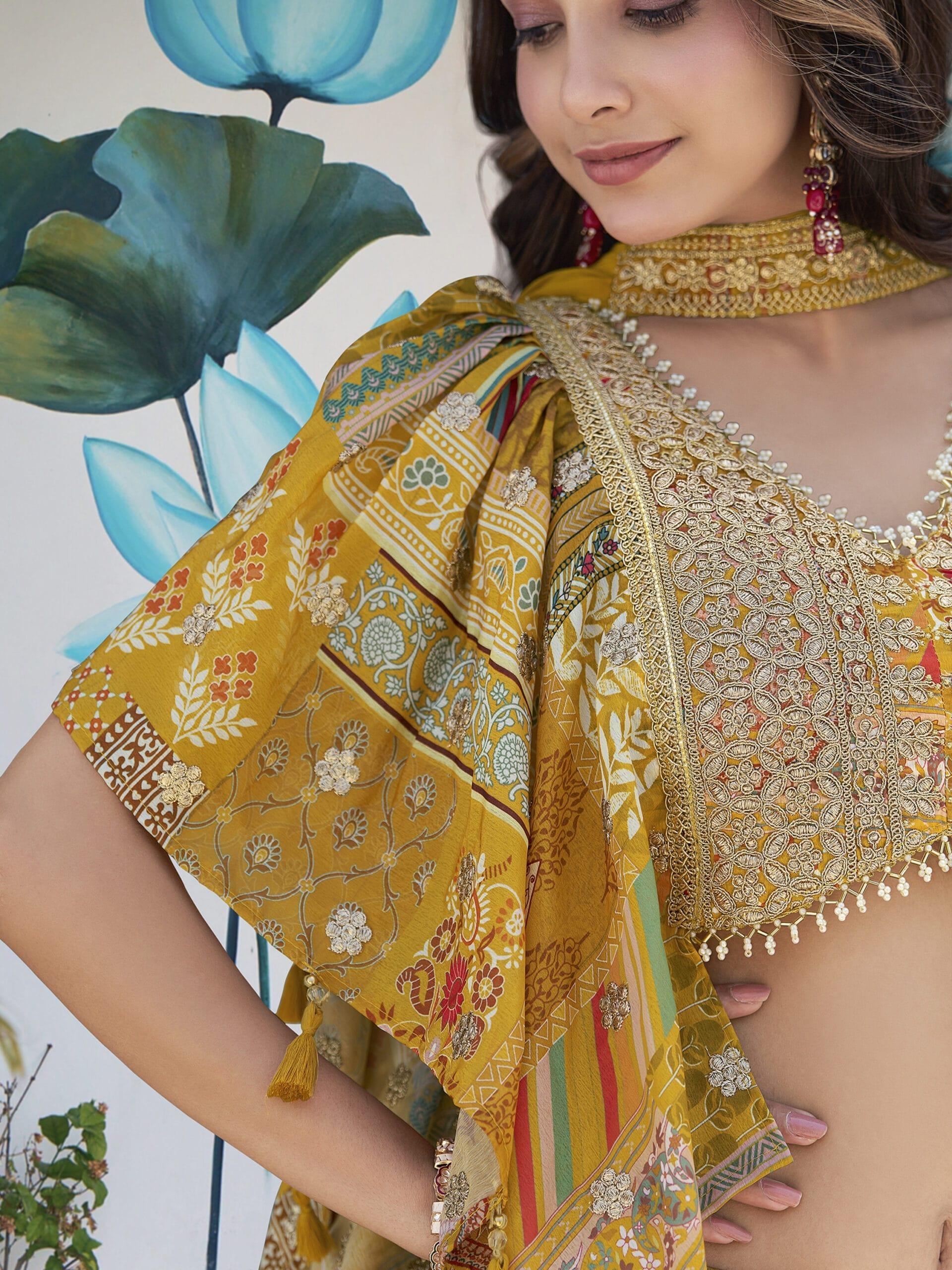 Be the first to review “Yellow Chinnon Silk Lehenga with Digital Print & Zari Dori Embroidery” Cancel reply