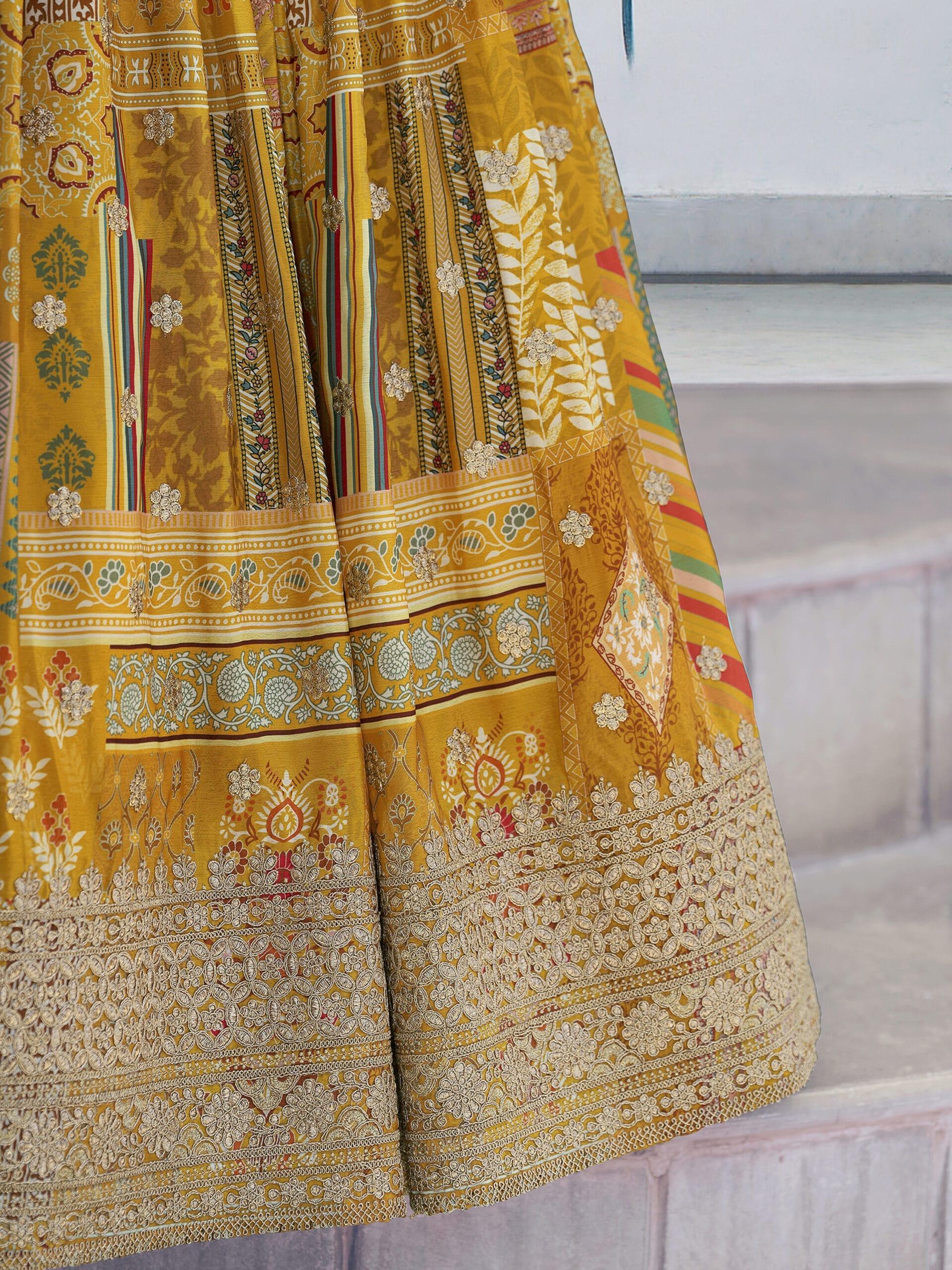 Yellow Chinnon Silk Lehenga with Digital Print & Zari Dori Embroidery