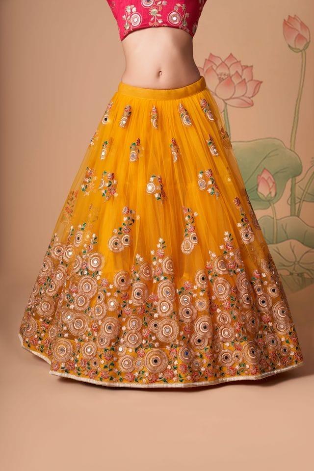 Be the first to review “Yellow Soft Net Lehenga with Thread, Zari, Dori & Sequins Embroidery and Mirror Work” Cancel reply